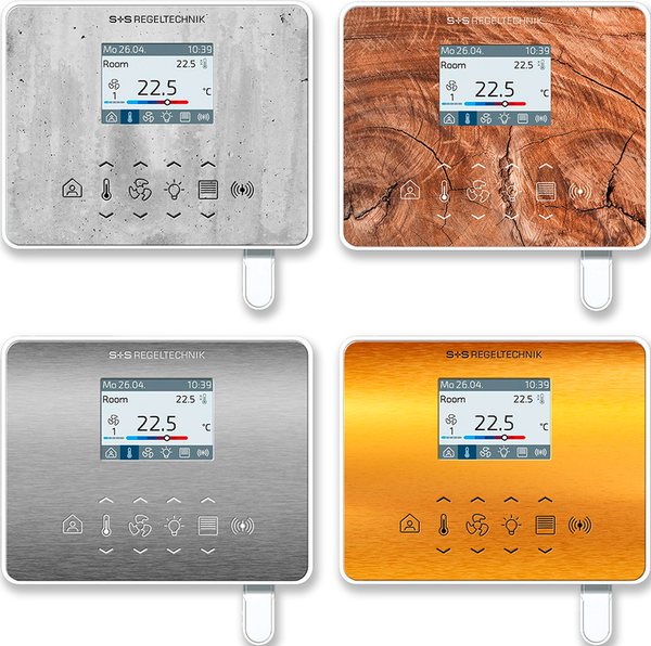 La interfaz de comunicación Modbus o W-Modbus permite modificar y supervisar en todo momento los parámetros climáticos del regulador a través del BMS. Además, las funciones de protección solar (persianas exteriores, persianas venecianas) o la luz (con función de regulación) pueden controlarse a través del bus. La visualización se muestra en una pantalla TFT de 2" y el manejo se realiza mediante botones capacitivos (teclas táctiles).
