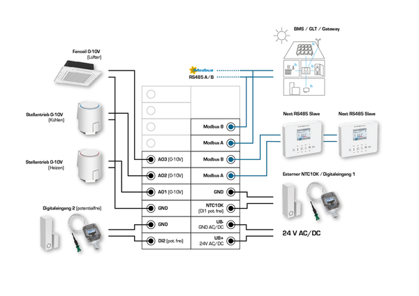 La interfaz de comunicación Modbus o W-Modbus permite modificar y supervisar en todo momento los parámetros climáticos del regulador a través del BMS. Además, las funciones de protección solar (venecianas exteriores, persianas venecianas) o la luz (con función de regulación) pueden controlarse a través del bus. La visualización se muestra en una pantalla TFT de 2" y el manejo se realiza mediante botones capacitivos (teclas táctiles).