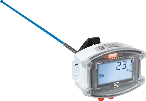 Transductor de temperatura de valor medio conectable en red THERMASGARD MWTM - EtherCATP con conector enchufable M8 (codificado EtherCATP), apto para Bluetooth, en carcasa de plástico resistente a los golpes con tornillos de cierre rápido, opcionalmente con/sin pantalla y gráfico de barras, con varilla de sensor flexible (0,4...20 m, totalmente activa) en robusto tubo protector de cobre con revestimiento de plástico, incl. brida de montaje.