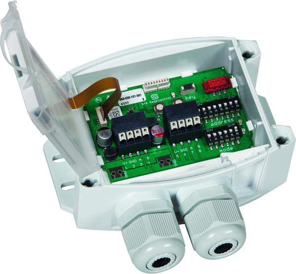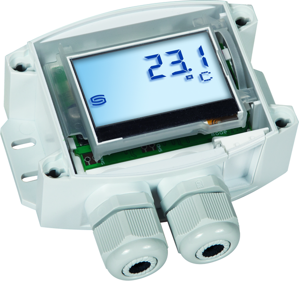 Innovador sensor Modbus con interfaz Modbus RS485 aislada galvánicamente, resistencia de terminación de bus conmutable, interruptor DIP para el ajuste de los parámetros de bus y la dirección de bus en estado sin corriente, LED internos para la visualización del estado de los telegramas, dos bornes de conexión separados y gran pantalla de tres líneas (iluminada, programable individualmente en el rango de 7 segmentos y en el rango de matriz de puntos). Mediante autodiagnóstico la rotura o el cortocircuito del sensor se reconocen como errores. Los mensajes de error se pueden consultar a través del Modbus y se muestran en la pantalla. El sensor viene calibrado de fábrica; es posible un ajuste fino por parte de un especialista en función del entorno.