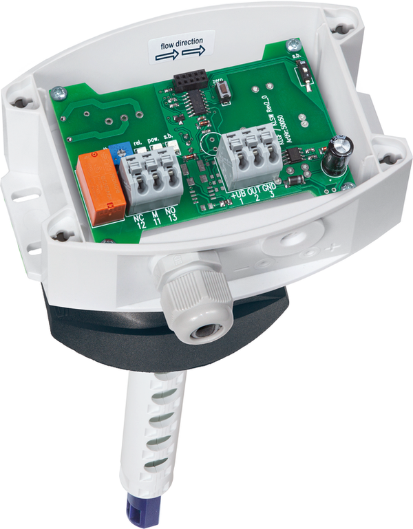Control electrónico del caudal de aire en conductos RHEASREG KLSW con salida de conmutación, carcasa de plástico resistente a los golpes con tornillos de cierre rápido, con prensaestopas, opcionalmente con ⁄ sin pantalla, para determinar la velocidad de flujo (0,1...20 m/s).