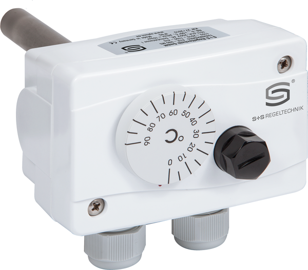 Dispositivo mecánico de control de la temperatura/termostato de varilla THERMASREG ETR con salida de conmutación, que se utiliza para supervisar, controlar o limitar la temperatura de medios líquidos o gaseosos como regulador de calderas o en la técnica de calefacción, ventilación y climatización, así como en la construcción de máquinas y aparatos y en los sistemas de generación de calor. Está diseñado como dispositivo de una o dos etapas, como regulador de temperatura regulable TR, controlador de temperatura TW o limitador de temperatura de seguridad STB.