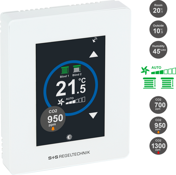 Como modelo básico, el RYMASKON Controlador 610 con pantalla táctil en color (3,5") en una carcasa blanca con sensor de temperatura y humedad integrado (sensor de CO2 opcional), 2 entradas analógicas para sensores externos (0...10 V), 1 entrada digital, 3 salidas analógicas (0...10 V) y conexión Modbus o BACnet opcional. Las unidades de control de estancias se utilizan para controlar la temperatura, el ventilador y la protección solar (2 zonas) directamente a través de las salidas analógicas o a través del bus.
