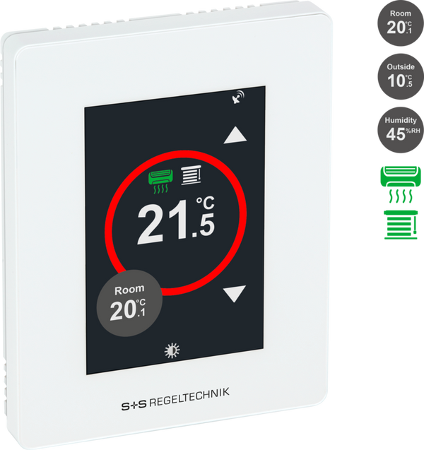 El modelo básico RYMASKON 510 Termostato con pantalla táctil en color (3,5"), en una carcasa blanca, dispone de un sensor de temperatura y humedad integrado, 2 entradas de resistencia (para sensores de temperatura externos NTC10K), 1 entrada digital, 1 salida de relé (7A) y opcionalmente con conexión Modbus o BACnet. Las unidades de control de estancias se utilizan para controlar la calefacción/refrigeración directamente a través del relé (control de 2 puntos), así como la iluminación, el aire acondicionado y la protección solar (1 zona) a través del bus.
