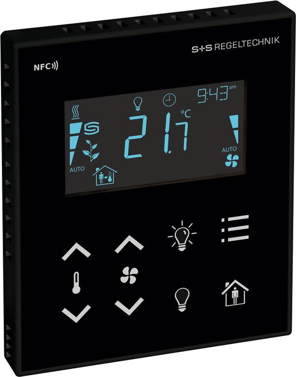 La pantalla multifunción, especialmente diseñada para el funcionamiento en sala, puede atenuarse y ofrece una visualización clara de todos los datos disponibles de la sala mediante símbolos intuitivos. Además de la hora, la fecha y los parámetros climáticos (temperatura, humedad, punto de rocío, contenido de CO2), también se pueden visualizar otras funciones como el funcionamiento del ventilador o la ocupación de la sala. El color de la retroiluminación puede adaptarse al diseño de la habitación.