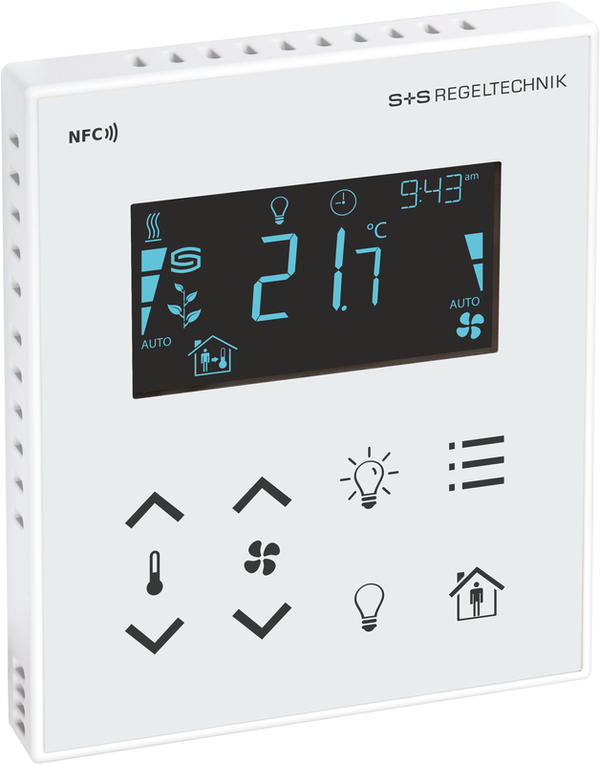 La pantalla multifunción, especialmente diseñada para el funcionamiento en sala, puede atenuarse y ofrece una visualización clara de todos los datos disponibles de la sala mediante símbolos intuitivos. Además de la hora, la fecha y los parámetros climáticos (temperatura, humedad, punto de rocío, contenido de CO2), también se pueden visualizar otras funciones como el funcionamiento del ventilador o la ocupación de la sala. El color de la retroiluminación puede adaptarse al diseño de la habitación.