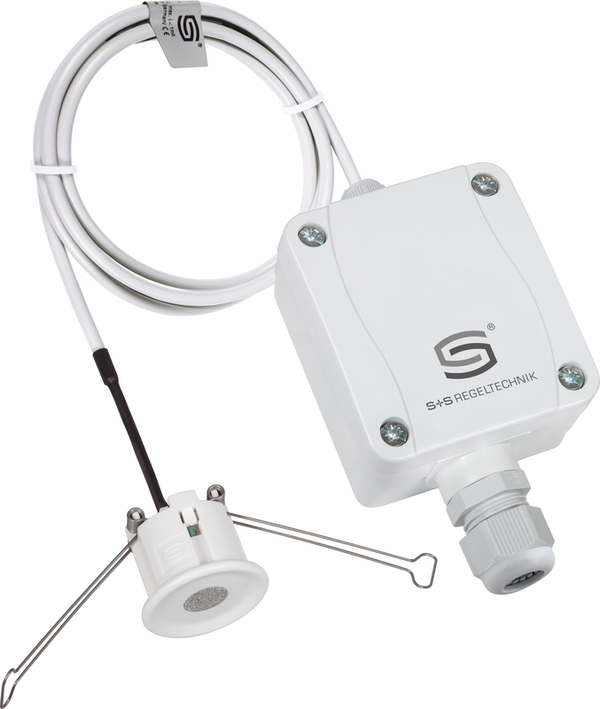 The recessed ceiling sensor is used in non-aggressive, dust-free environments and is used for installation in false ceilings in corridors, offices, residential and commercial premises. The connection head is pluggable for quick and easy installation. The measuring transducer is located in a separate housing.