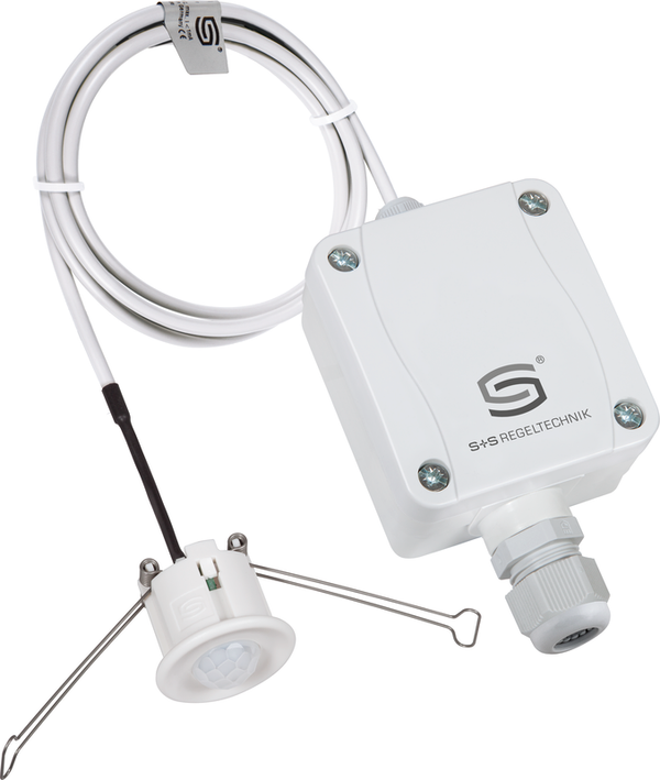 The ceiling movement sensor KINASGARD® DBWF detects the presence of people and movement and has a switching contact (changeover contact) as an output. The motion detector is used for monitoring, detecting statuses and motion-dependent control of room functions, e.g. for lowering the temperature in unused rooms.