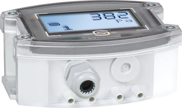 Calibratable dual pressure sensors/dual differential pressure transducers and volume flow transducers PREMASGARD® 722x (series) with 2 x 8 switchable measuring ranges, 2 automatic output signals (32 devices in one), housing with pressure connection spigot made of impact-resistant plastic, optionally with/without display, with cable gland or M12 plug connector in accordance with DIN EN 61076-2-101 for measuring positive, negative or differential air pressures. The pressure transmitters automatically detect the required output type and convert the measured variables into the required standard signal of 0-10 V or 4...20 mA (Automatic Output Switching). We have patented this unique technology.