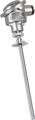 Resistance thermometer/flue gas temperature sensor THERMASGARD® RGTF 1 with passive output, optionally with cable gland or M12 plug connector to DIN EN 61076-2-101, with aluminum connection head and straight protective tube, incl. mounting flange.