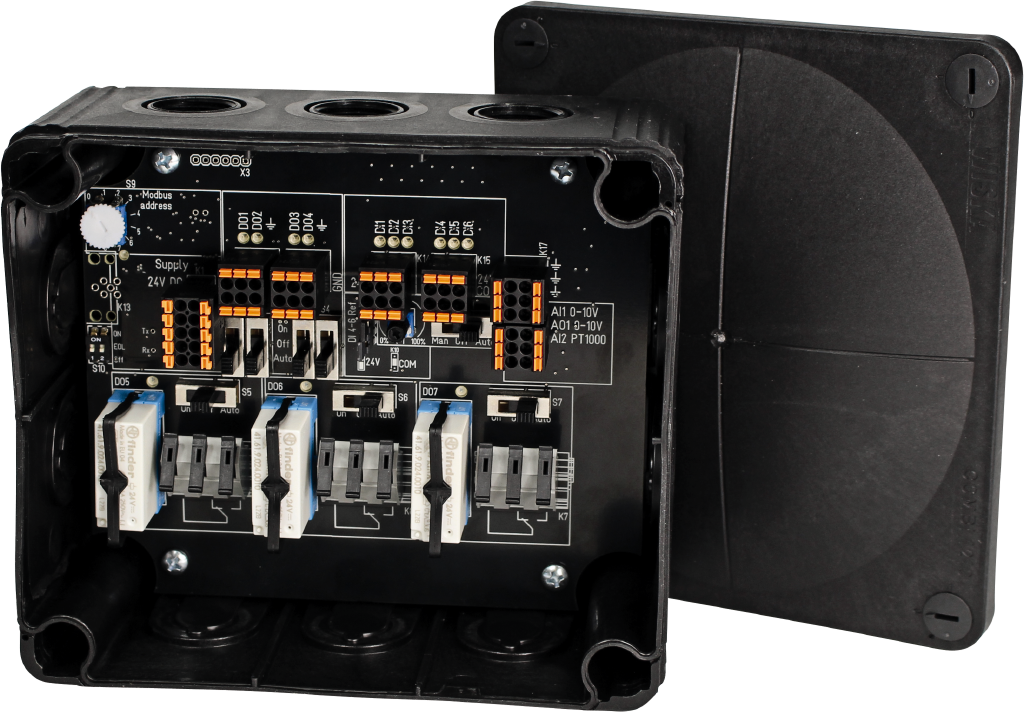 Outputs each with manual override (switch/potentiometer). Addressable via rotary switch. Connection via Modbus RTU. Dimensions 160 x 140 x 83 mm (W x H x D)