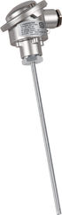 Calibratable temperature transmitter THERMASGARD® TM 54 with eight switchable measuring ranges and continuous output, with aluminum connection head and straight protection tube. One basic device in four variants through combination with accessories, e.g. for robust applications with separate stainless steel immersion sleeve.