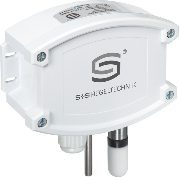 Condensation-protected surface-mounted sensor HYGRASREG® AFTF-35 with active and switching output, housing made of impact-resistant plastic with quick-locking screws, cable gland, plastic sinter filter (replaceable), optionally with ⁄ without display, for recording relative humidity (0...100 % RH) and temperature (4 switchable measuring ranges, max. 0...+100 °C) as well as for determining various humidity measurement technology parameters. The measuring transducer converts the measured variables into a standard signal of 0 - 10 V or 4...20 mA.