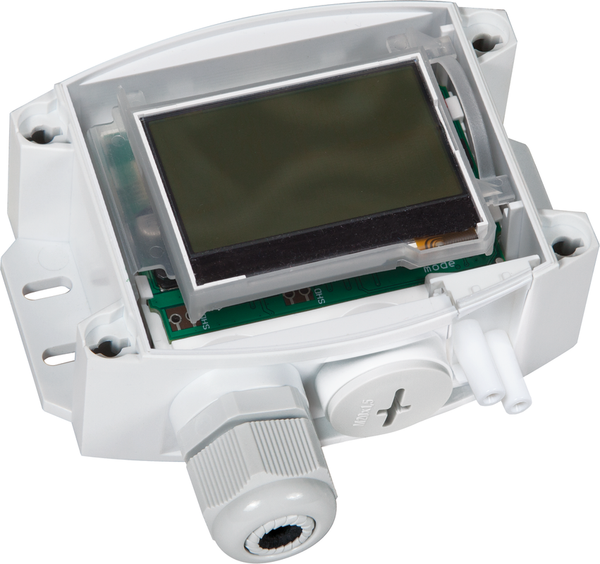 Maintenance-free pressure sensor PREMASGARD® 232x - Modbus - T3 (series), with Modbus connection, in impact-resistant plastic housing with quick-locking screws, connection piece for pressure hose (Ø 6 mm), with cable gland (optional M12 plug connector to DIN EN 61076-2-101), optionally with ⁄ without display, for measuring the pressure (max. ± 7000 Pa) in air. International system of units SI (default) is set to Imperial (via Modbus). Incl. connection set ASD-06 (2 m connection hose, two Pressure connection nipples, screws).