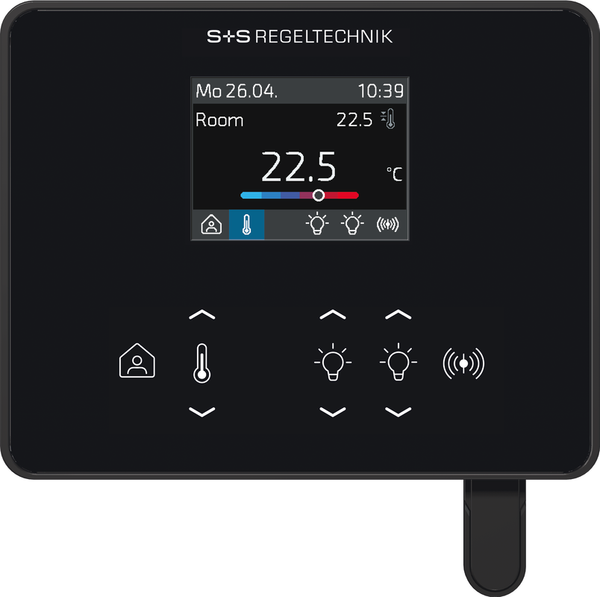 The Modbus or W-Modbus communication interface enables the climate parameters on the controller to be changed and monitored at any time via the BMS. In addition, the sun protection functions (external blinds, venetian blinds) or light (with dimming function) can be controlled via the bus. The visual display is shown on a 2" TFT display and operation is via capacitive buttons (touch keys).
