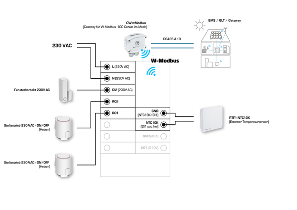 In addition to the integrated temperature and humidity sensor, optional sensors for CO2 and VOC are available. There is also an input for a passive temperature sensor (NTC10K) and an input for a potential-free contact. For example, a window contact or a condensation monitor can be connected. This gives you all the options you need to air-condition rooms flexibly and individually.