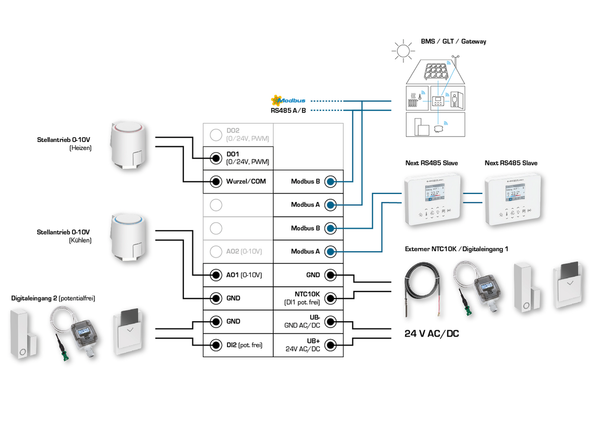 In addition to the integrated temperature and humidity sensor, optional sensors for CO2 and VOC are available. There is also an input for a passive temperature sensor (NTC10K) and an input for a potential-free contact. For example, a window contact or a condensation monitor can be connected. This gives you all the options you need to air-condition rooms flexibly and individually.