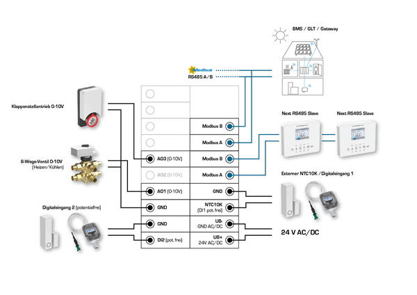 In addition to the integrated temperature and humidity sensor, optional sensors for CO2 and VOC are available. There is also an input for a passive temperature sensor (NTC10K) and an input for a potential-free contact. For example, a window contact or a condensation monitor can be connected. This gives you all the options you need to air-condition rooms flexibly and individually.